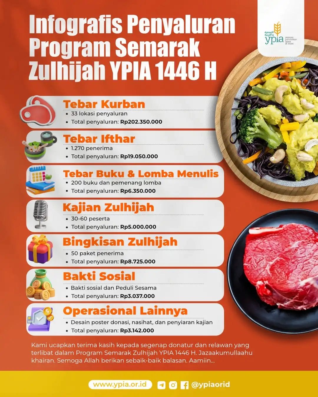 Alhamdulillahilladzi bini’matihi tatimmush shaalihaat, Berikut kami sampaikan data penyaluran donasi dan Tebar Kurban untuk program Semarak Zulhijjah YPIA 1446 Hijriah: