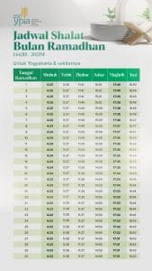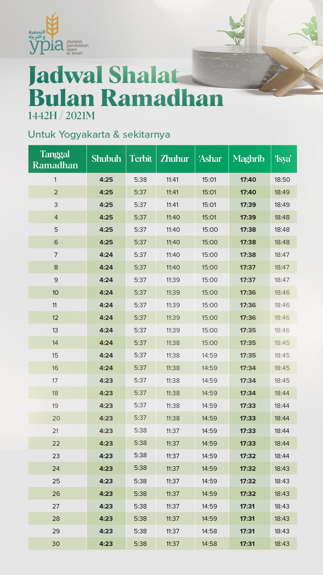 Panitia Semarak Ramadan YPIA telah membuat Jadwal Salat pada Bulan Ramadan 1442 H, berikut jadwal untuk Daerah Istimewa Yogyakarta dan sekitarnya :