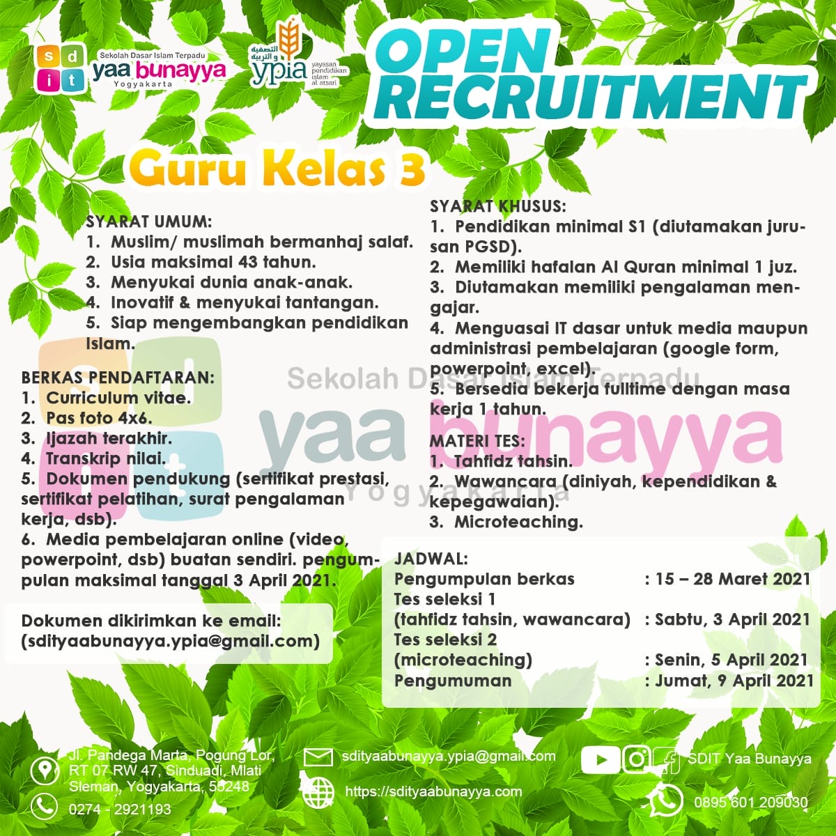 SDIT Yaa Bunayya membuka lowongan pekerjaan untuk Guru Kelas 3, silakan bagi siapa saja yang ingin melamar dan memenuhi persyaratan bisa mengirimkan berkas lamaran sesuai informasi di bawah ini.