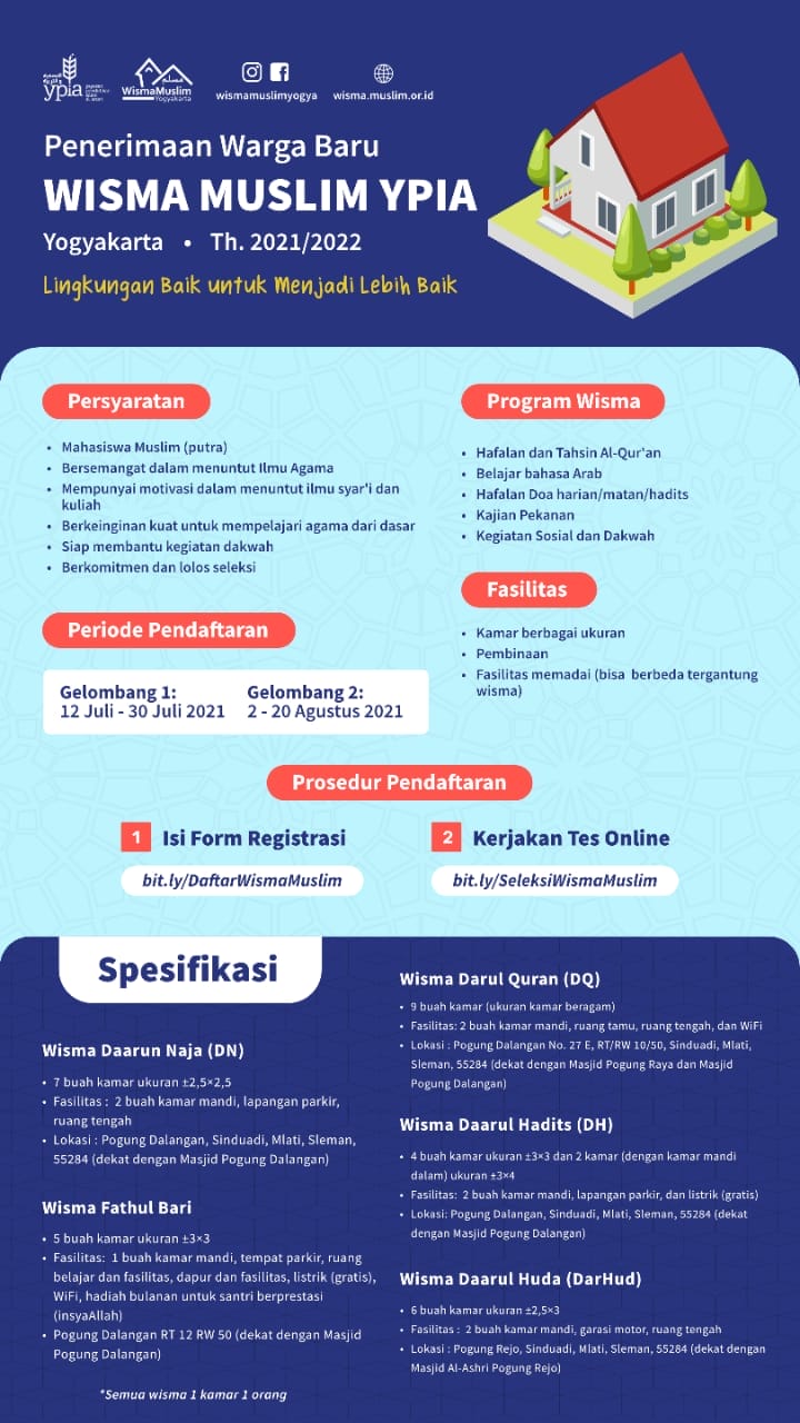 Alhamdulillah, telah dibuka pendaftaran wisma muslim angkatan 2021/2022. Tidakkah kau ingin berkuliah sambil menuntut ilmu agama disertai dengan lingkungan yang bagus yang dapat menuntunmu dalam kebaikan?