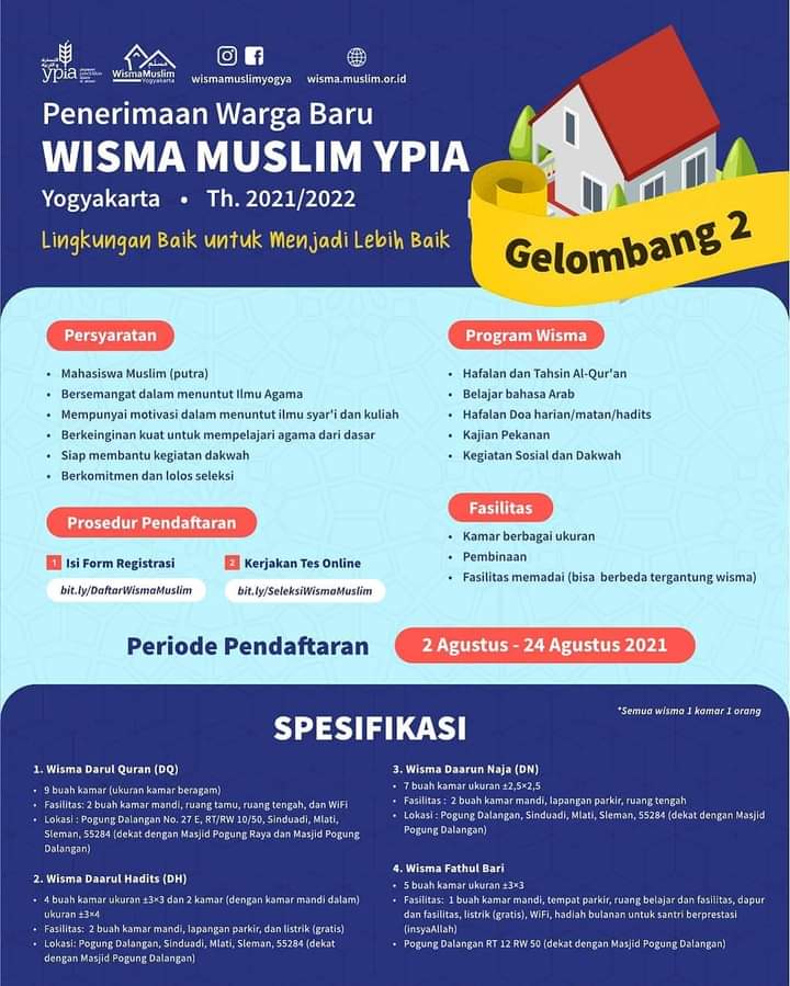 Alhamdulillah, telah dibuka pendaftaran wisma muslim angkatan 2021/2022. Tidakkah kau ingin berkuliah sambil menuntut ilmu agama disertai dengan lingkungan yang bagus yang dapat menuntunmu dalam kebaikan?