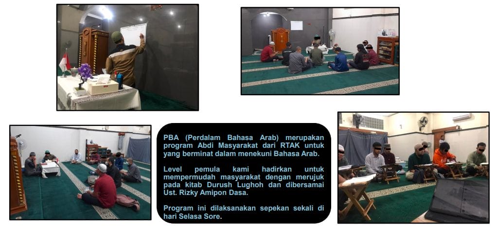 Rumah Tahfizh Ashabul Kahfi merupakan salah satu tempat untuk belajar memperdalam Al-Quran. Selain banyak agenda untuk santri, terdapat pula program khusus yang ditujukan untuk pengabdian masyarakat. Program tersebut adalah PBA (Perdalam Bahasa Arab) dimana program ini adalah Abdi Masyarakat dari RTAK untuk masyarakat yang berminat dalam menekuni Bahasa Arab. Level pemula ini kami hadirkan untuk mempermudah masyarakat memahami bahasa arab dengan merujuk pada kitab Durush Lughoh dan dibersamai Ust. Rizky Amipon Dasa. Agenda ini dilaksanakan sepekan sekali dihari Selasa Sore secara rutin.