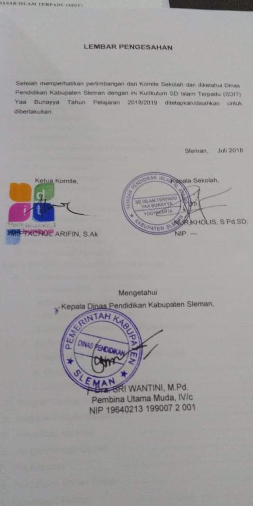 Alhamdulillah, kurikulum SDIT Yaa Bunayya telah resmi disahkan oleh Dinas Pendidikan Kabupaten Sleman.