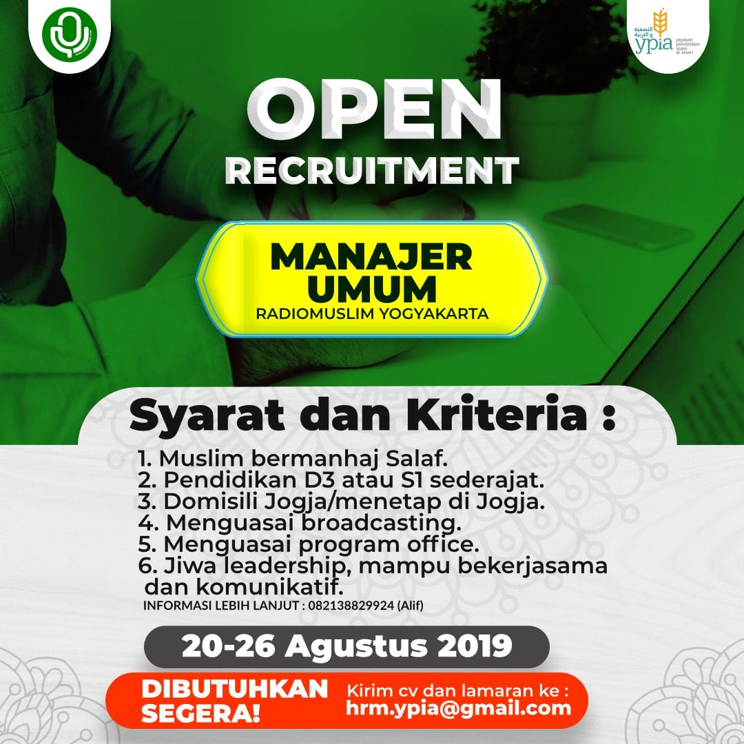 Open Recruitment Manajer Umum Radio Muslim Yogyakarta Periode pendaftaran: 20-26 Agustus 2019 Syarat & Kriteria: 1. Muslim bermanhaj Salaf 2. […]